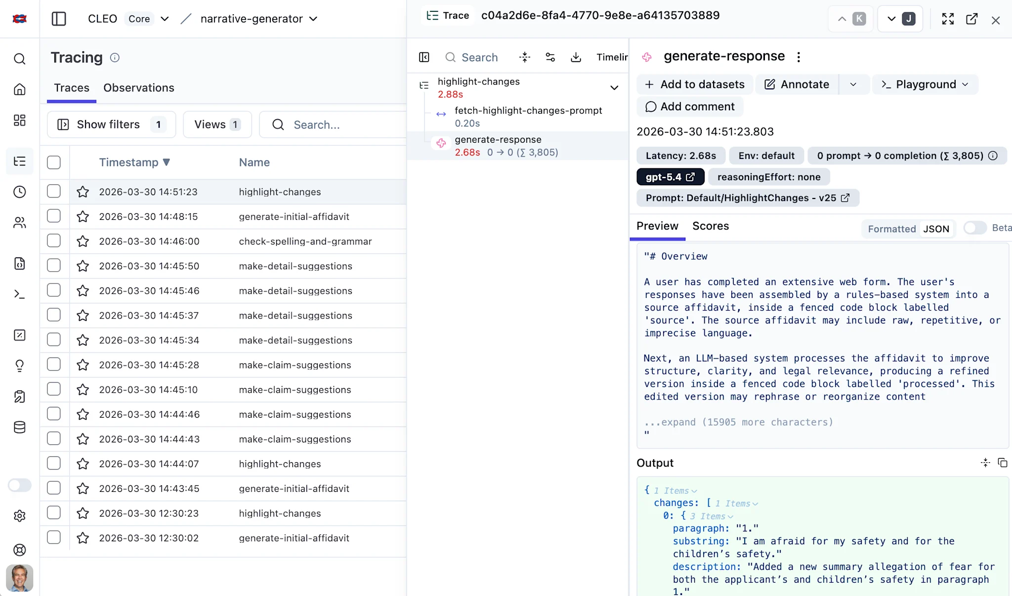 Tangowork designed and developed the Narrative Assistant, a custom AI application powered by OpenAI’s GPT models and integrated with Langfuse for rigorous AI observability and prompt management. The tool transforms rigid decision-tree outputs into clear, logical, and persuasive affidavits. To ensure user trust, Tangowork engineered a transparent “Highlight Changes” feature that explains every AI edit , alongside a three-part Suggestion Framework (Claim Checker, Story Checker, and Evidence Checker) that safely prompts users to supply missing facts or evidence.
