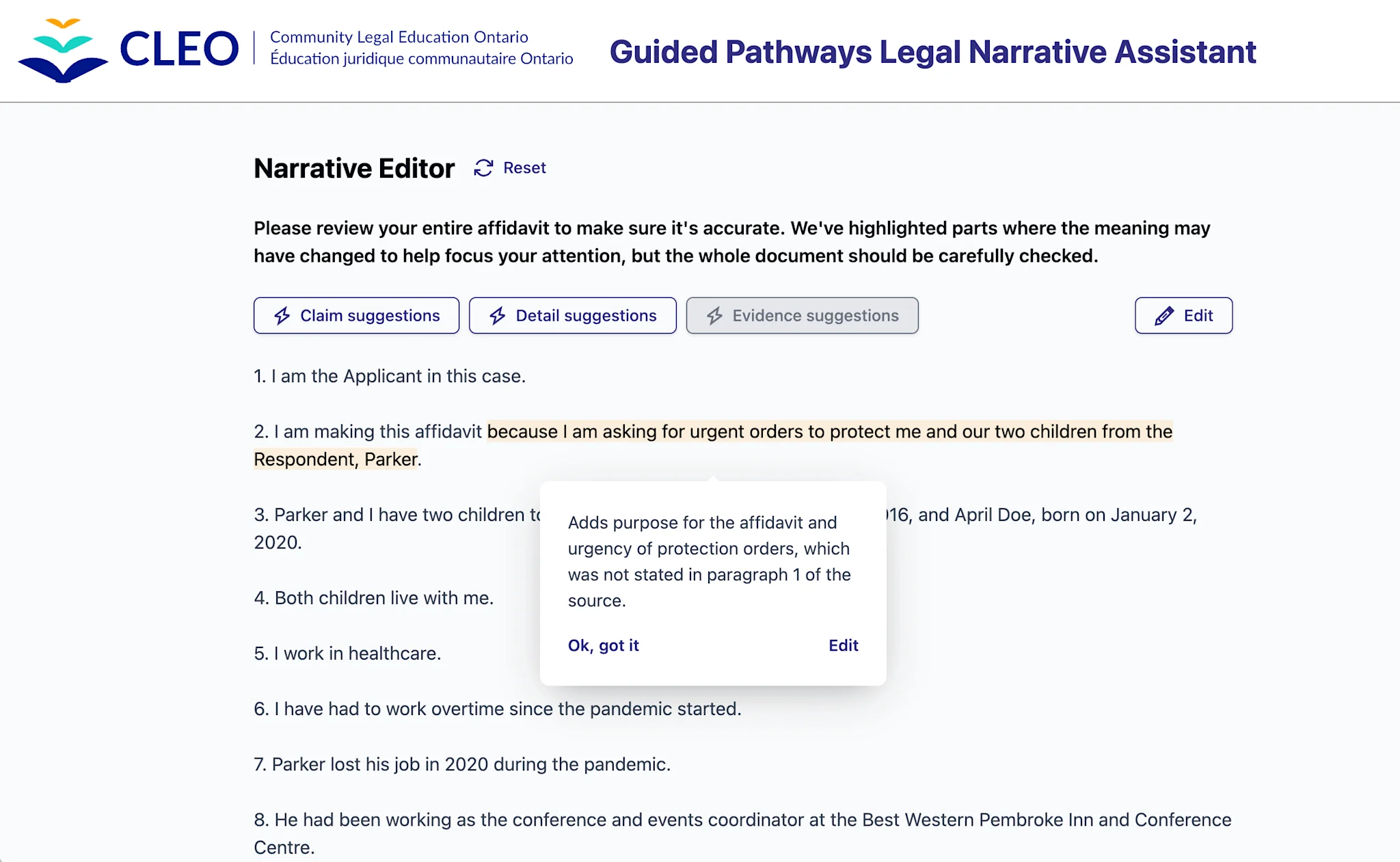Across Ontario, thousands of self-represented individuals rely on CLEO’s Guided Pathways to navigate intimidating legal procedures. While these rules-based decision trees are excellent at assembling complex forms, the resulting text often lacks narrative flow and appropriate emphasis. These disjointed narratives make it difficult for users to persuasively tell their story to the court, a critical disadvantage in urgent matters like emergency family law motions.