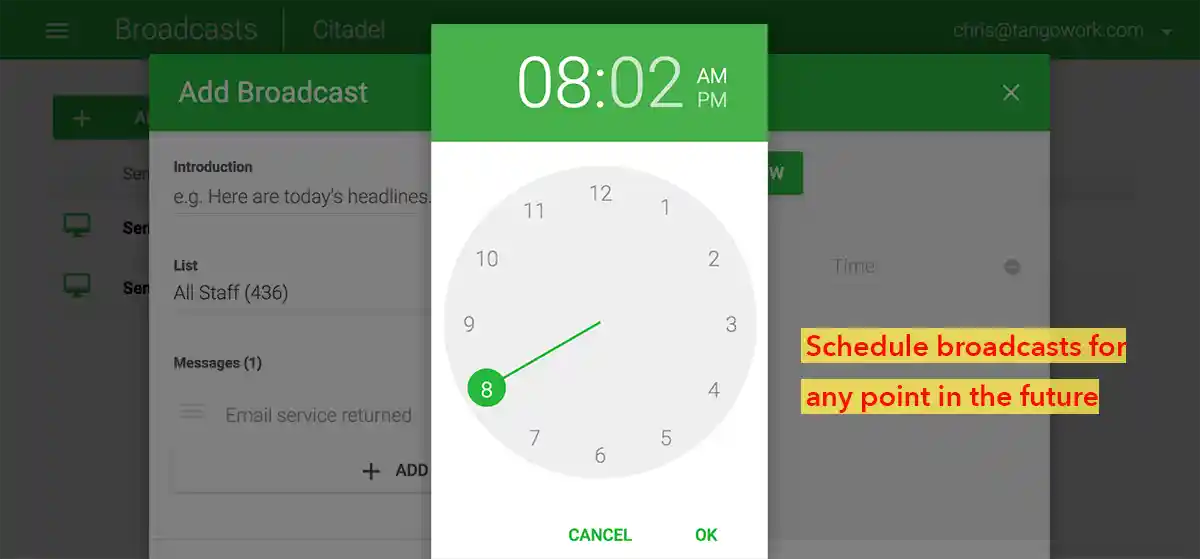 Send broadcasts instantly, or schedule them for any point in the future.