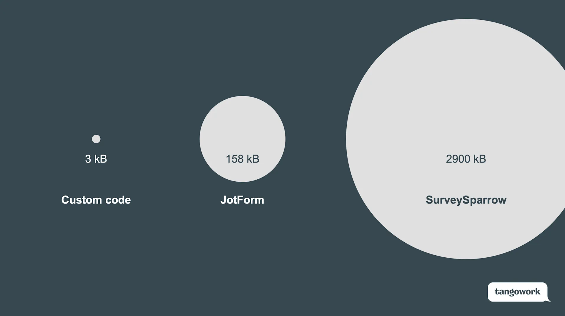 Tangowork developed a survey that added just 3KB to the page weight. In contrast, the same survey developed in JotForm was 50X larger, and in SurveySparrow, almost 1000X larger!